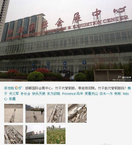 燕赵晚报:网友李龙晓图文报料:邯郸国际会展中心广场前排水沟盖板,竟然是水泥和竹子混制而成。看看被踩碎的水泥板,这样的质量真是不敢恭维啊!这一个个坑,能摔着人不?“竹筋” 能取代钢筋吗?